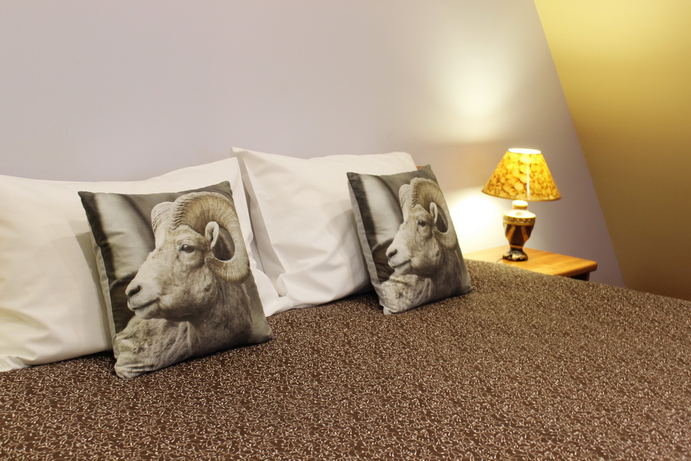 Ērta divvietīga gulta ar satīna gultas veļu, istaba izbūvēta mansardā ar tumšām koka sijām, apaļiem jumta lodziņiem, ar skatu uz upi un upes pļavām..